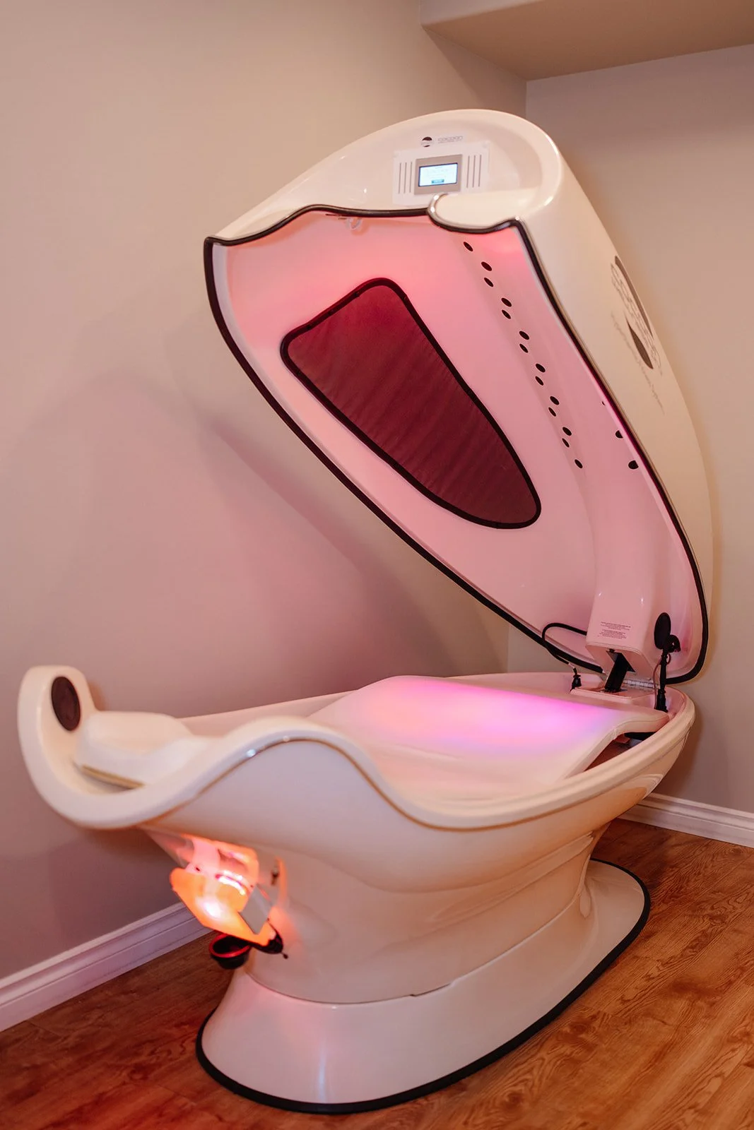 Relax in our Steam Pod. Pick your vitamin concentrate to hydrate, detox or wake up your skin. Plus the deep heat and vibrational massage will relieve sore, tired muscles.